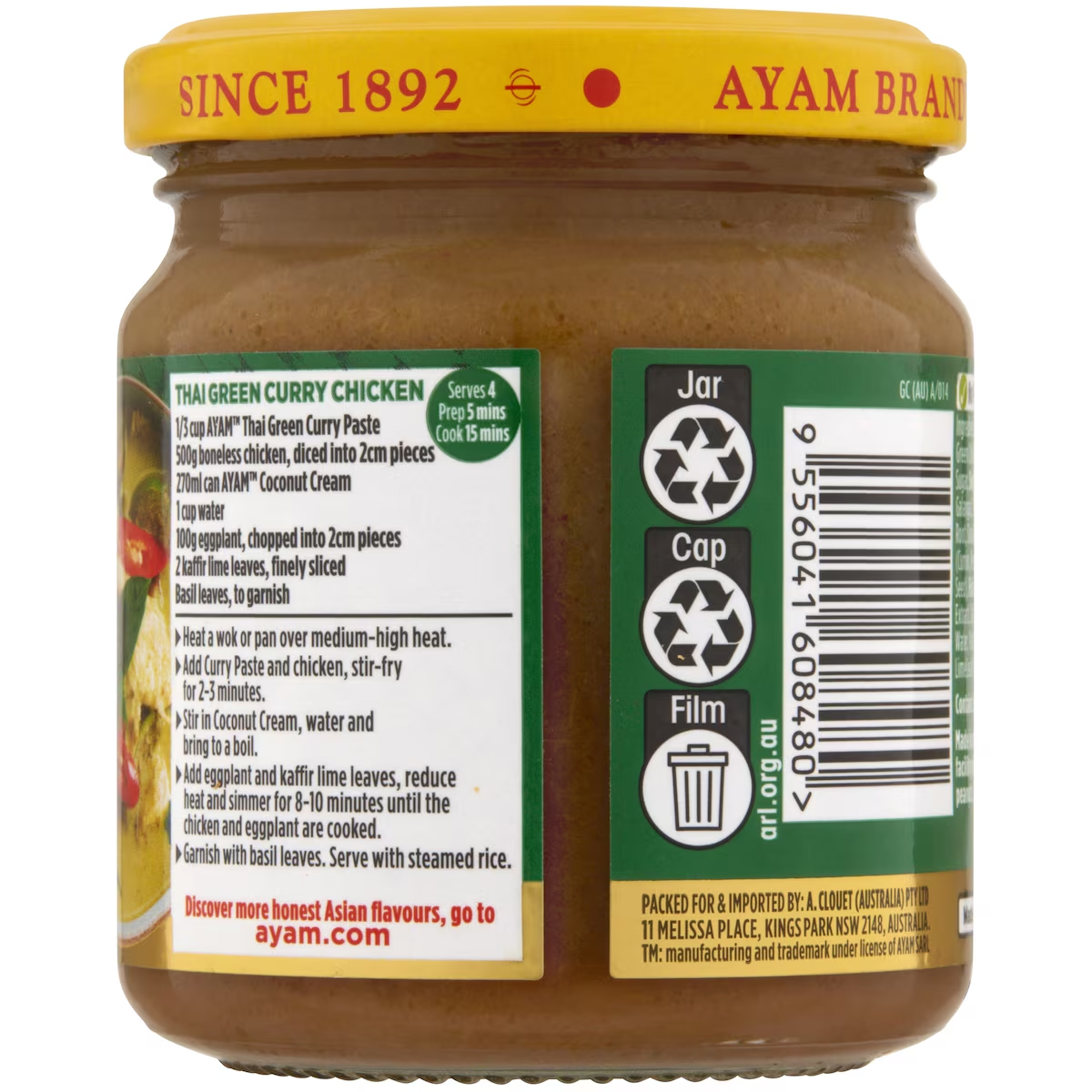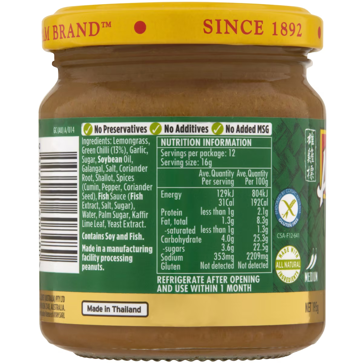 Ingrédients : Citronnelle, piment vert (13 %), ail, sucre, huile de soja, galanga, sel, racine de coriandre, échalote, épices (cumin, poivre, graines de coriandre), sauce de poisson (extrait de poisson, sel, sucre), eau, sucre de palme, feuille de combava, extrait de levure