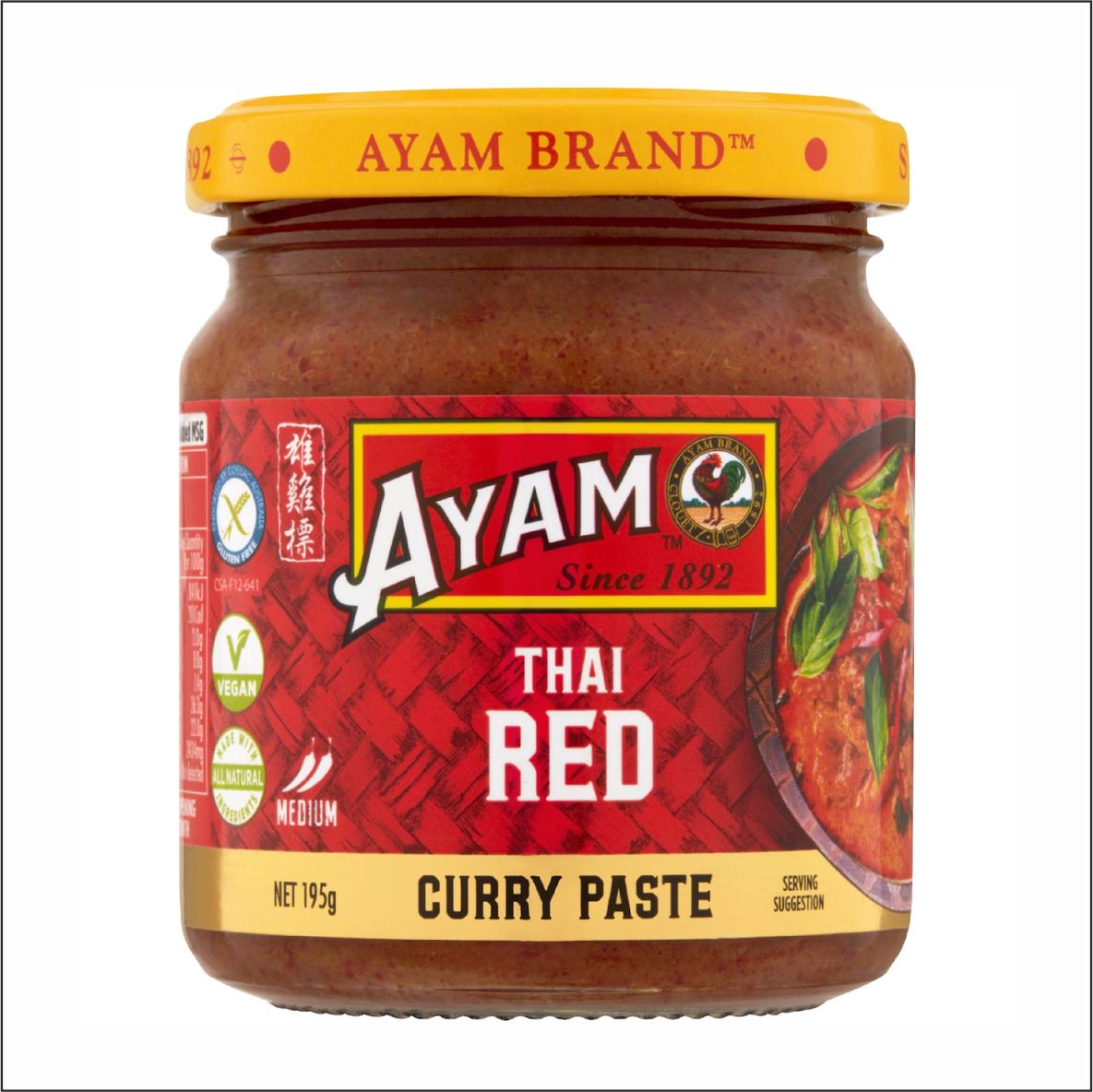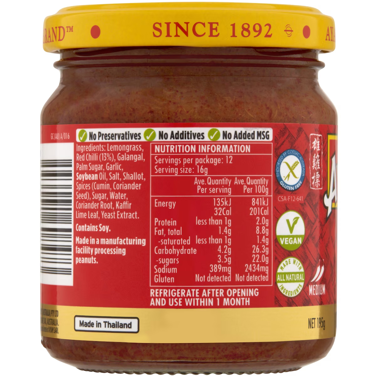 Ingrédients : Citronnelle, piment rouge (13 %), galanga, sucre de palme, ail, huile de soja, sel, échalote, épices (cumin, graines de