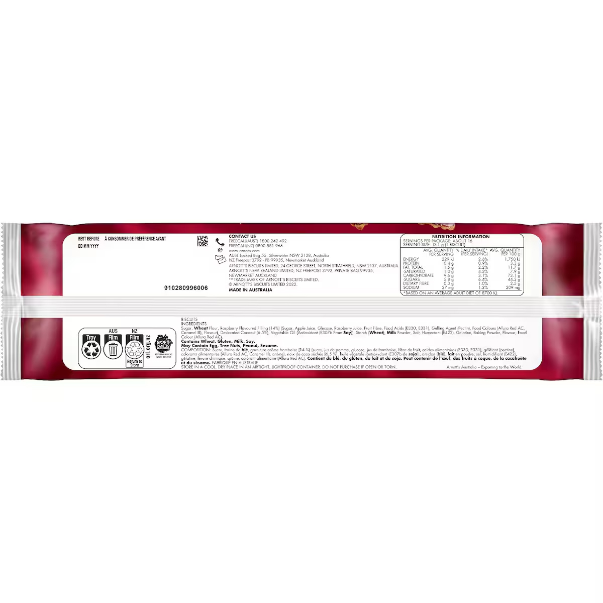 Ingrédients : Sucre, farine de blé, garniture aromatisée à la framboise (14 %) (sucre, jus de pomme, glucose, jus de framboise,