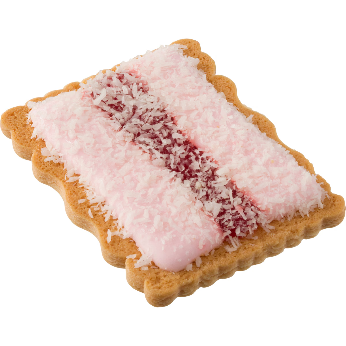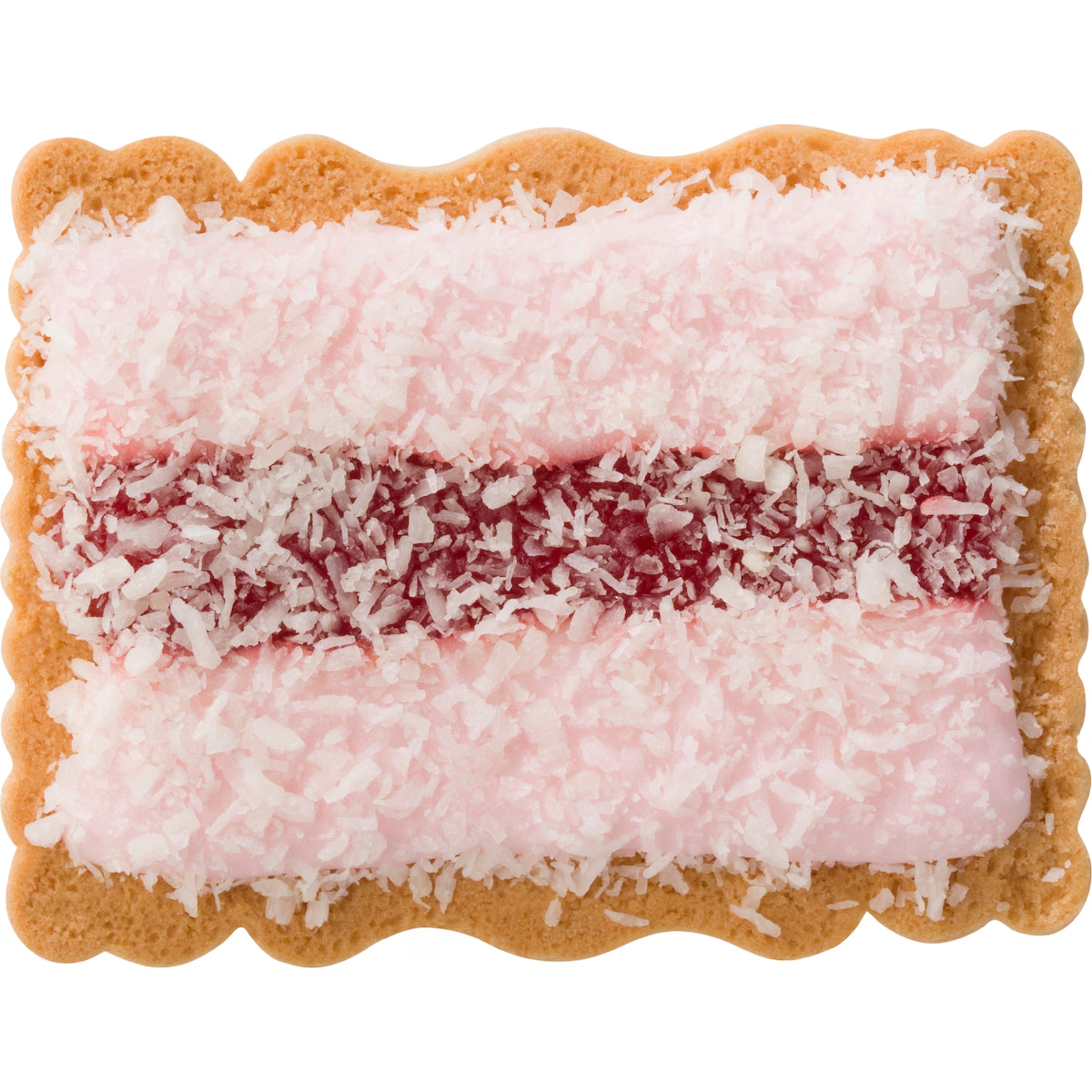 • Biscuit doré et sucré avec un glaçage rose, de la confiture de framboise et de la noix de coco