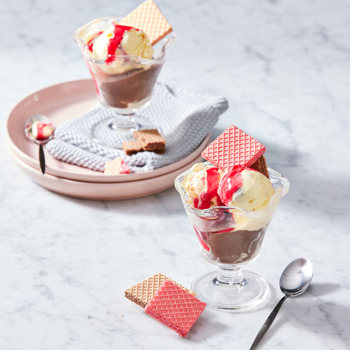 • Gaufrettes croustillantes fourrées d'une délicieuse crème à la framboise, à la vanille ou au chocolat