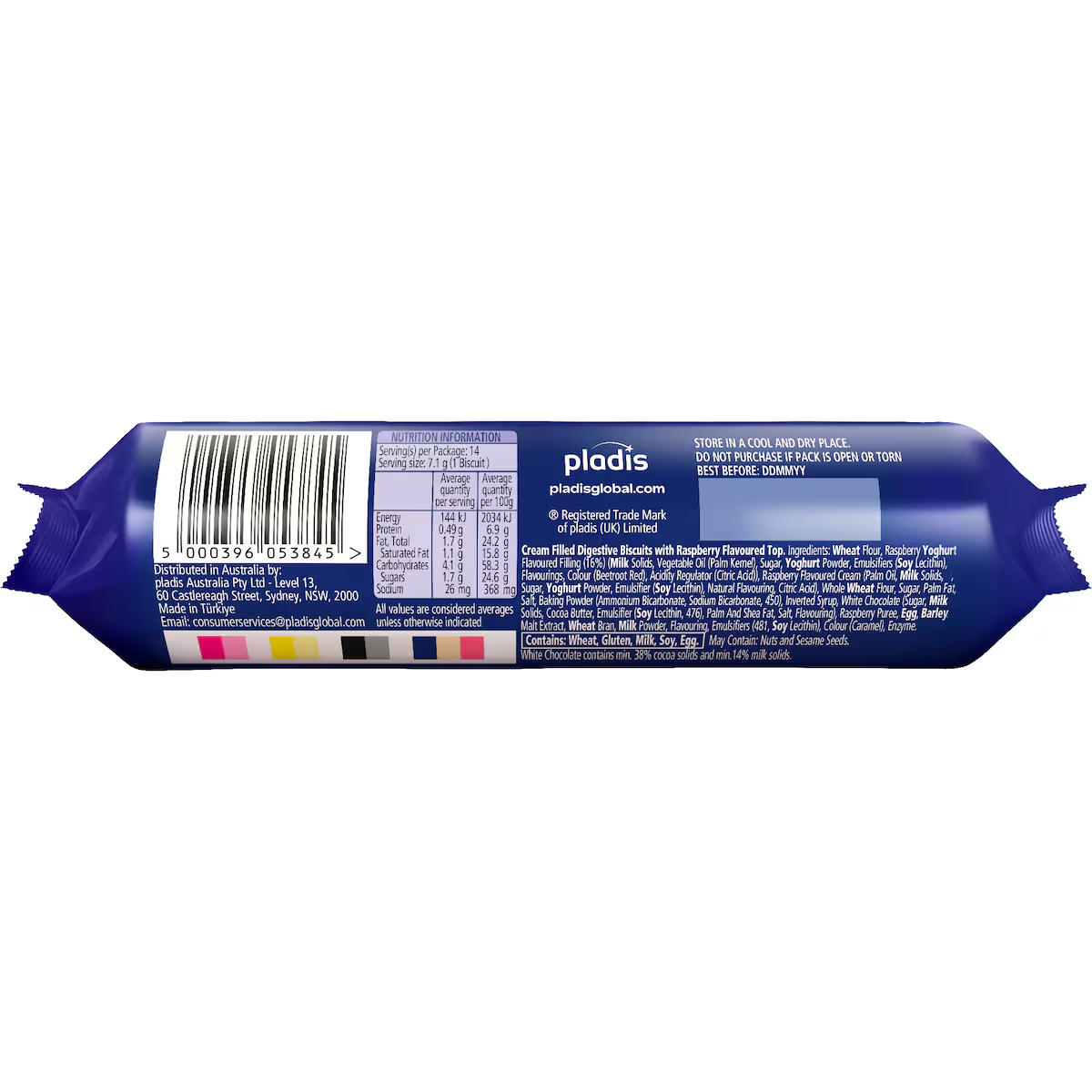 Ingrédients : Farine de blé, garniture au yaourt aromatisé à la framboise (16 %) (extrait sec de lait, graisses de palmiste, sucre,