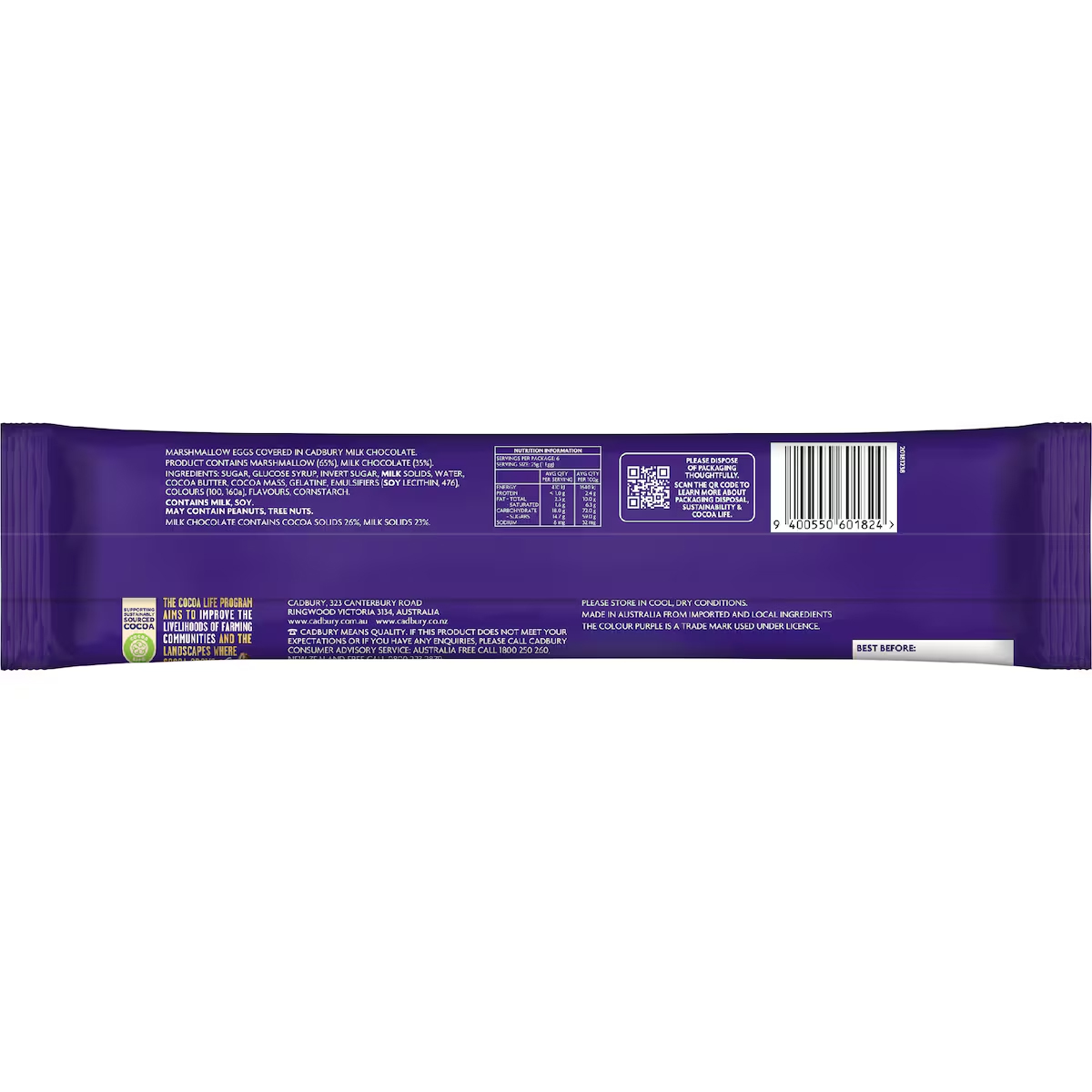 Ingrédients : Le produit contient de la guimauve (65 %) et du chocolat au lait (35 %). Ingrédients : Sucre, sirop de glucose,