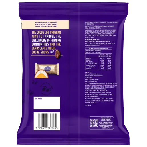 Ingrédients : Ce produit contient de la guimauve (65 %) et du chocolat au lait (35 %).