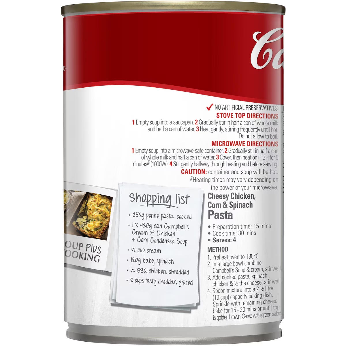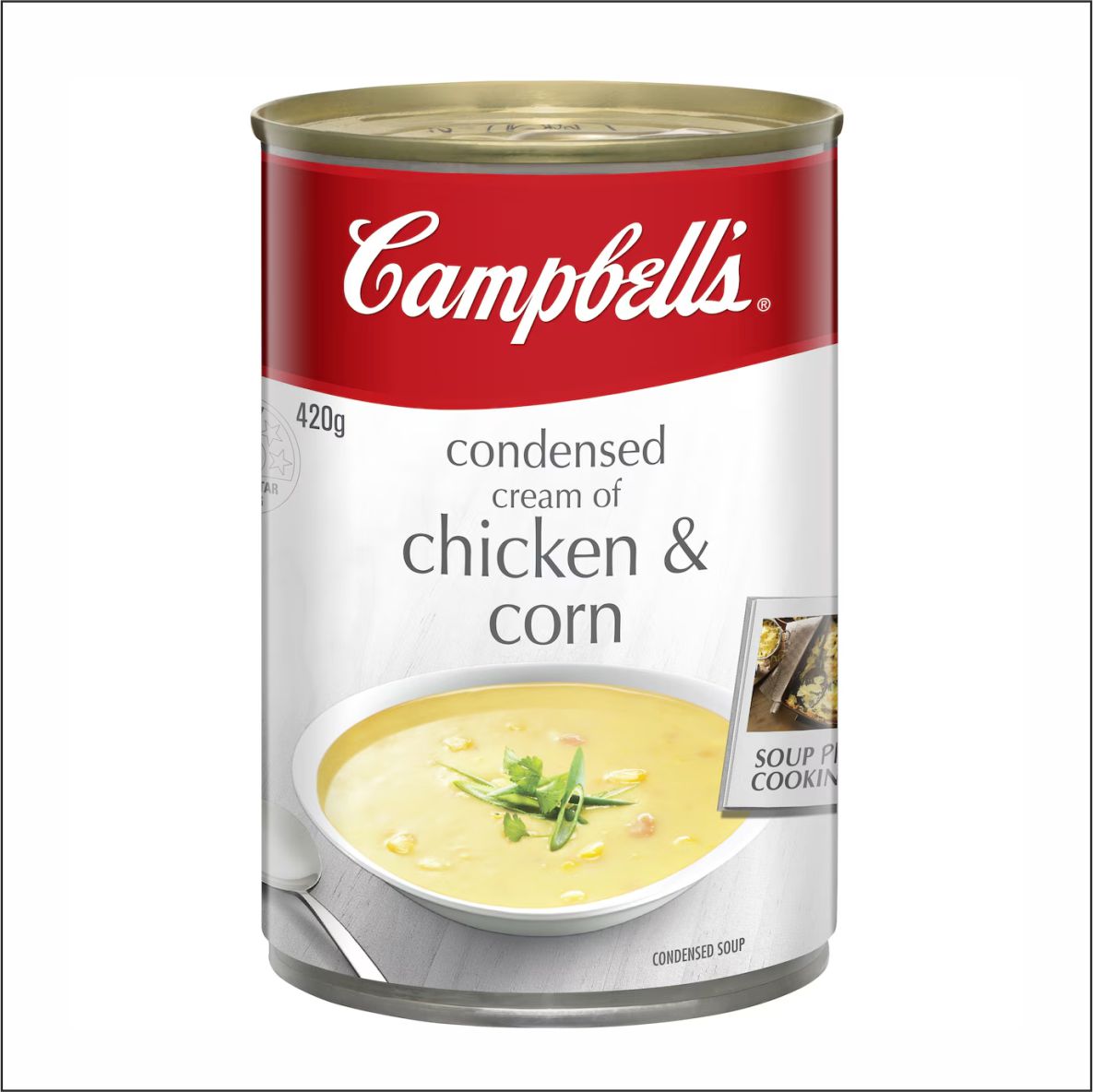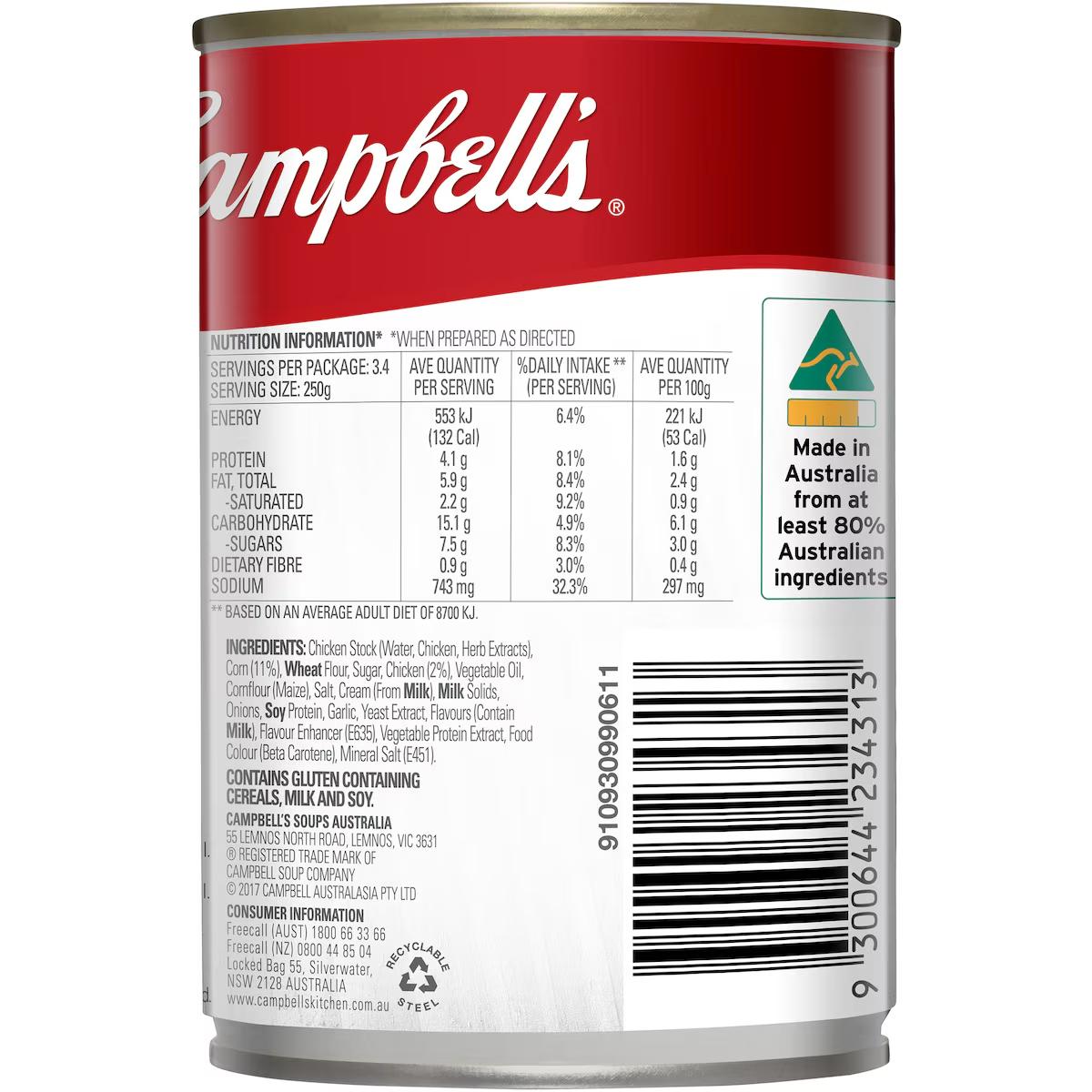 Ingrédients : Bouillon de poulet (eau, poulet, extraits d'herbes), maïs (11 %), farine de blé, sucre, poulet (2 %), huile végétale,