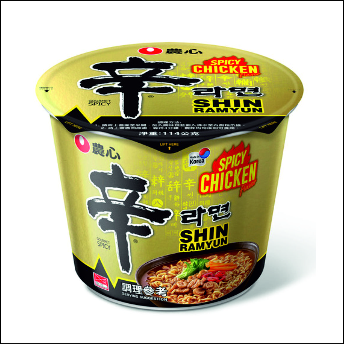 Ingrédients : Pâtes 89% : farine de blé, fécule de pomme de terre, huile de palme, sel, correcteurs d’acidité : E501, E500,339 ; épices (extrait de levure, soja, ail), antioxydant : E306 ; émulsifiant : E322 (Contient du soja) ; colorant : E101.