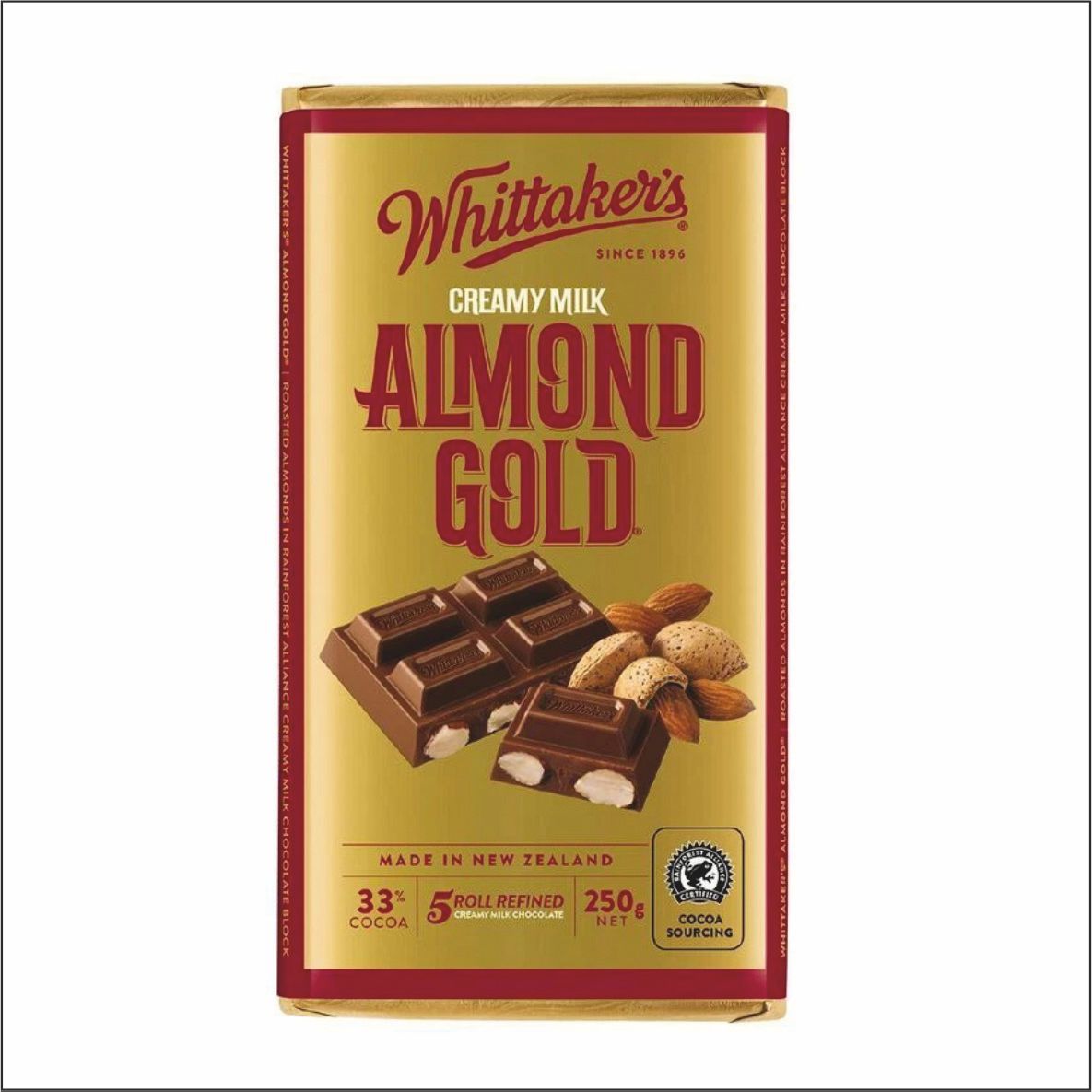Ingrédients : CHOCOLAT AU LAIT [SUCRE, PÂTE DE CACAO 33 %* (BEURRE DE CACAO PUR ET PÂTE DE CACAO), LAIT DE NOUVELLE-ZÉLANDE EN POUDRE 30 %*, ÉMULSIFIANT (LÉCITHINE DE SOJA, ARÔME DE VANILLE)] ; AMANDES GRILLÉES 25 %. * POURCENTAGE MINIMUM. + CERTIFIÉ PAR LA RAINFOREST ALLIANCE.