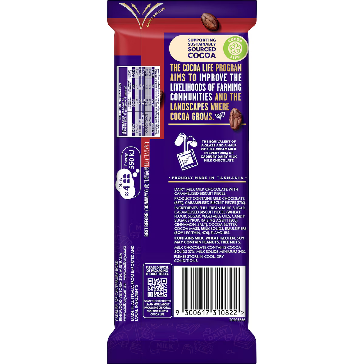 agent levant (500), cannelle, sel), beurre de cacao, pâte de cacao, matières sèches du lait, émulsifiants (lécithine de soja, 476),