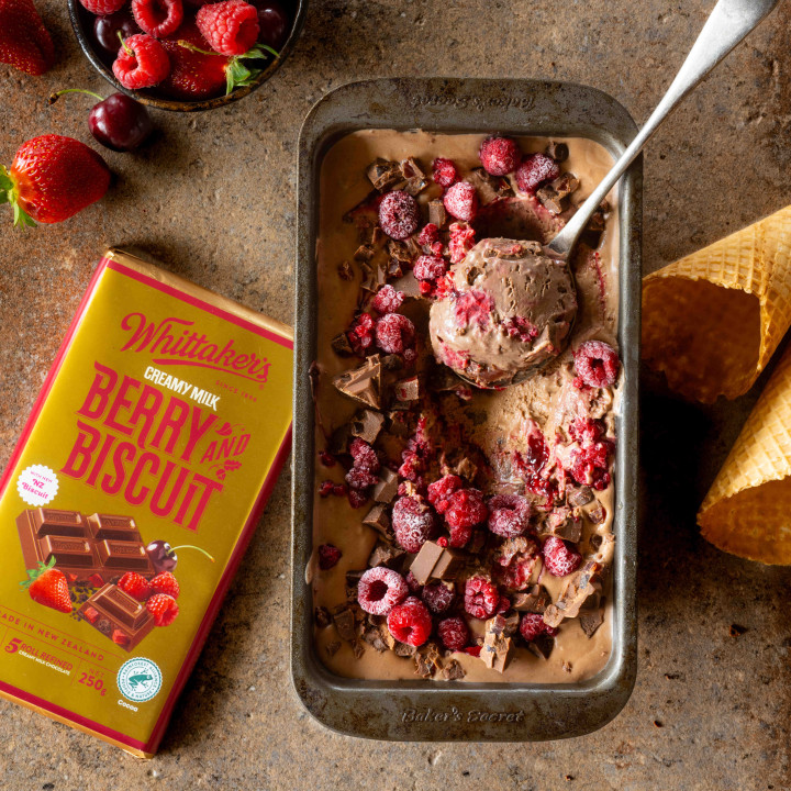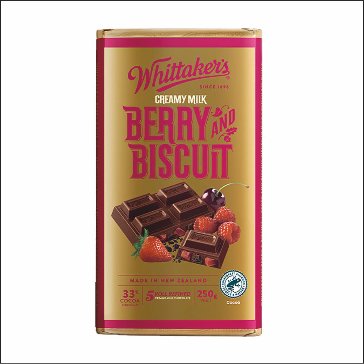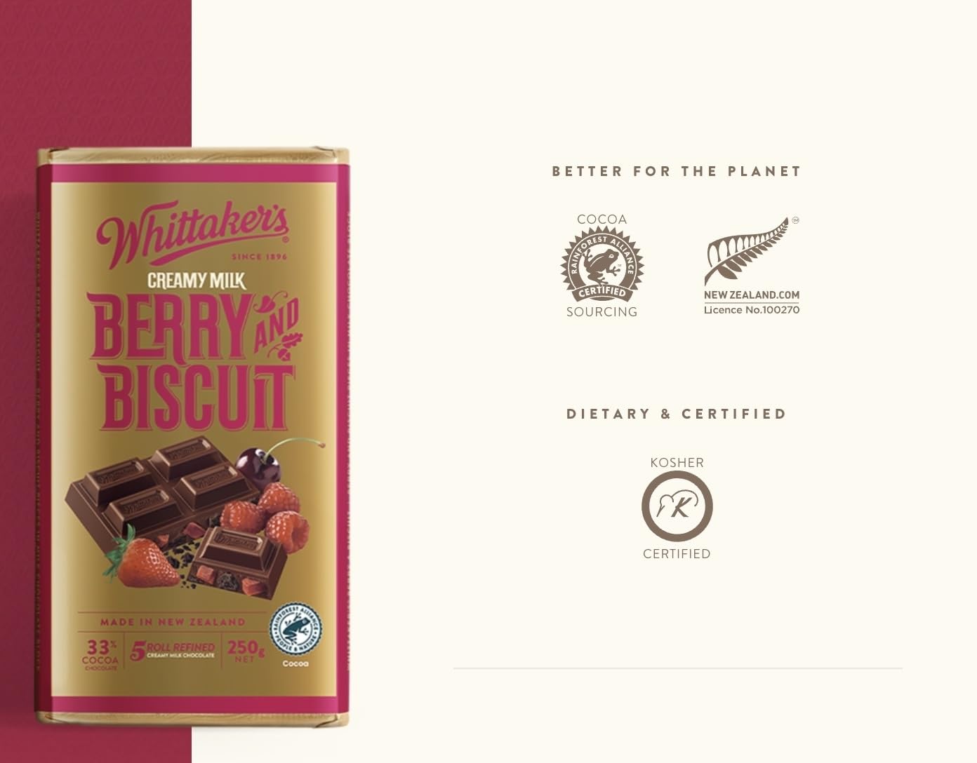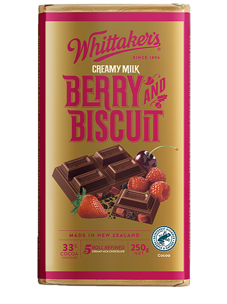 Ingrédients : CHOCOLAT AU LAIT [SUCRE, MATIÈRES GRASSES DE CACAO+ 33 %* (BEURRE DE CACAO⁺ ET PÂTE DE CACAO⁺), LAIT EN POUDRE DE NOUVELLE-ZÉLANDE 30 %*, ÉMULSIFIANT (LÉCITHINE DE SOJA), ARÔME DE VANILLE] ; MORCEAUX DE BAIES 16 % [MIXTE DE BAIES 36 % (PURÉES DE FRAISE, FRAMBOISE, CERISE, CASSIS) ; PURÉE DE POMME CONCENTRÉE, SUCRE INVERTI, HUMECTANT (GLYCÉROL), FIBRES DE BLÉ, SUCRE, GÉLIFIANT (PECTINE), ÉPAISSISSANT (GOMME DE CAROUBE), RÉGULATEUR D’ACIDITÉ (ACIDE CITRIQUE), ARÔME, CONCENTRÉS DE CAROTTE NOIRE ET DE CASSIS] ; MORCEAUX DE BISCUIT 7 % [FARINE DE BLÉ, SUCRE, HUILE DE TOURNESOL, CACAO EN POUDRE, HUMECTANT (SORBITOL), SEL, STABILISANT (GOMME XANTHANE), AGENT LEVANT (BICARBONATE DE SODIUM)]. *POURCENTAGE MINIMUM. ⁺CERTIFIÉ PAR LA RAINFOREST ALLIANCE. CONTIENT : LAIT, SOJA, BLÉ, GLUTEN. PEUT CONTENIR : ARACHIDES, AUTRES FRUITS À COQUE.