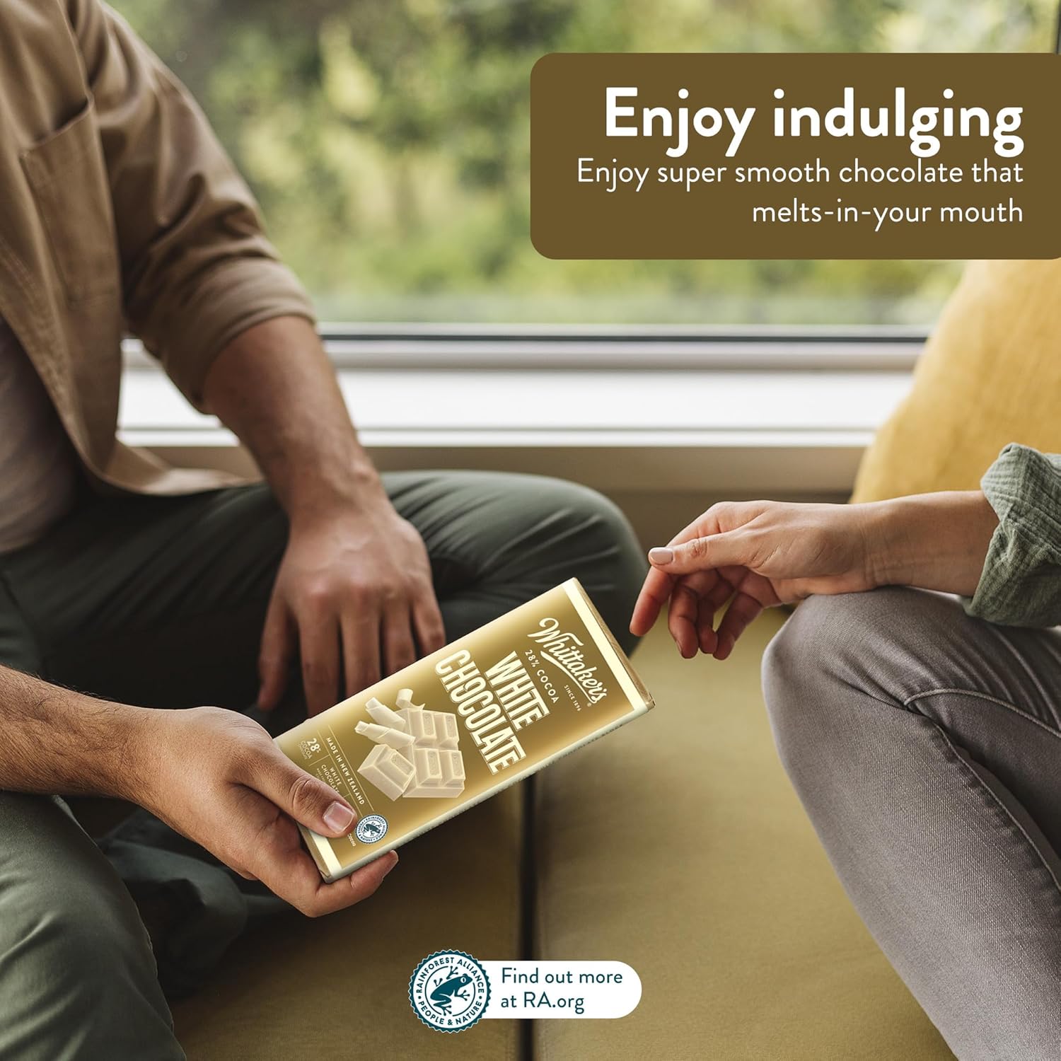 Une tablette de chocolat blanc onctueux Whittaker's, format idéal à partager. À 28 % de cacao, certifié Rainforest Alliance,